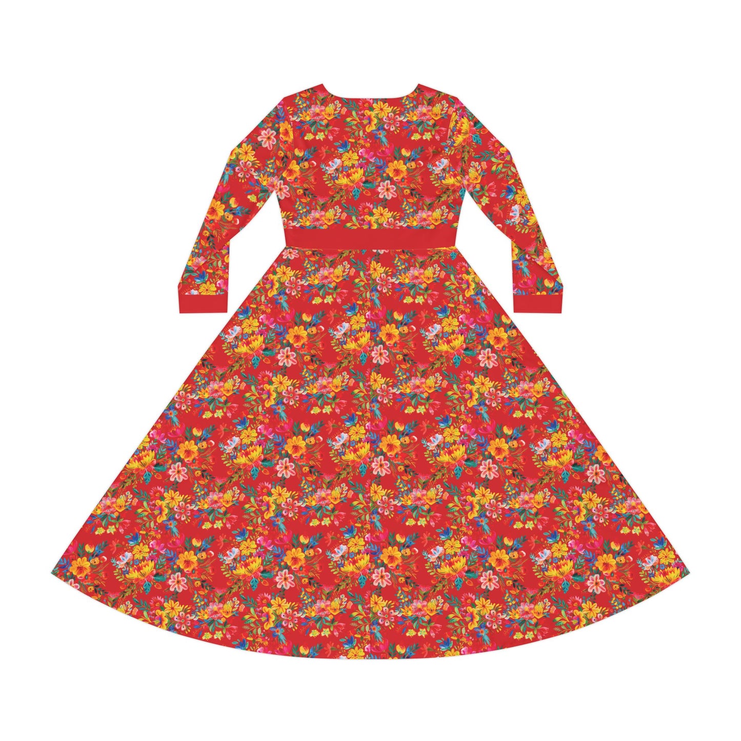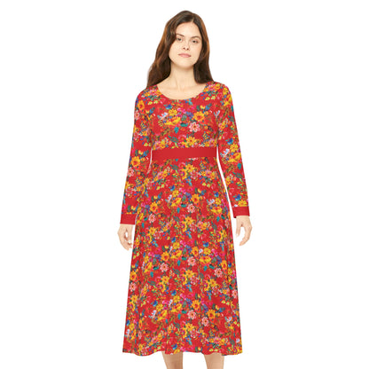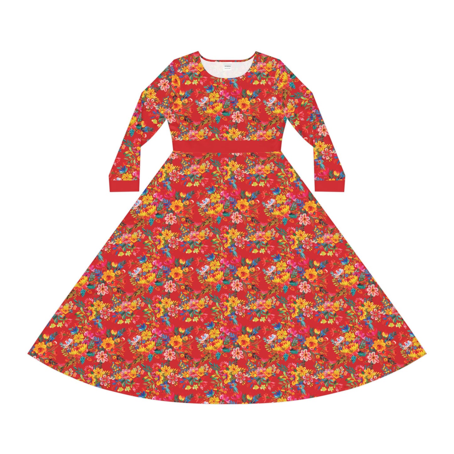 Elegant Women's Long Sleeve Dance Dress - Bright Bold Watercolors Flowers - Scarlet
